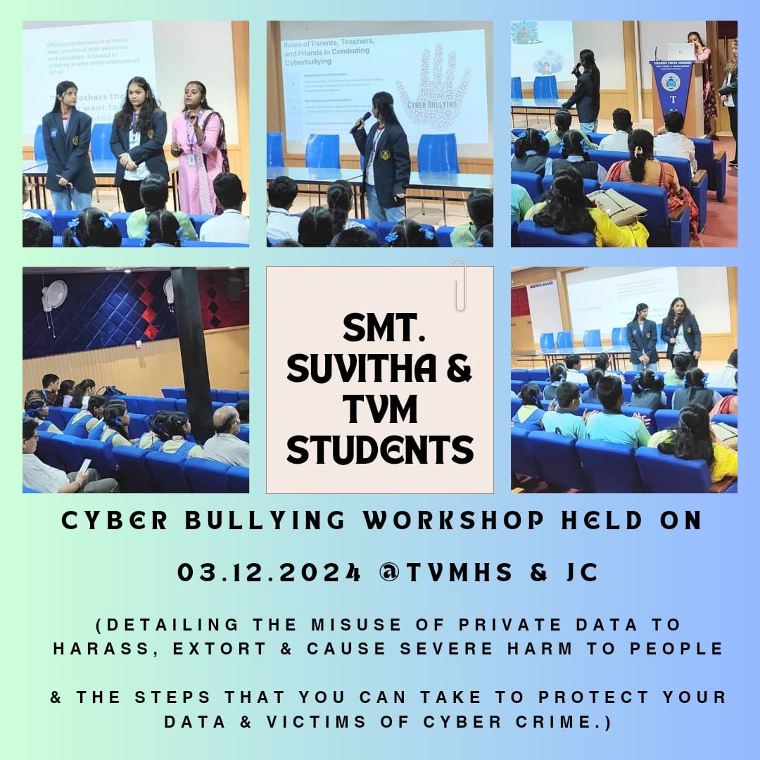 On December 3, 2024, TVMHS & JC hosted an impactful Cyber Bullying Workshop led by Smt. Suvitha and the enthusiastic students of TVM. The session aimed to educate attendees about the growing menace of cyberbullying, highlighting its misuse and the steps necessary to combat it.